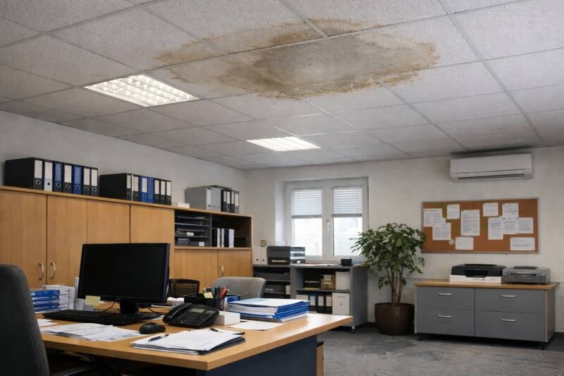 Auf dem Bild ist ein Wasserschaden an der Decke eines Büroraumes zu erkennen. Sichtbar sind Feuchtigkeitsverfärbungen und Wasserflecken an den Deckenplatten. Diese deuten auf einen Wassereintritt hin, dessen Ursache beispielsweise in einer undichten Leitung, einem Schaden in der darüberliegenden Etage oder an technischen Anlagen liegen kann.